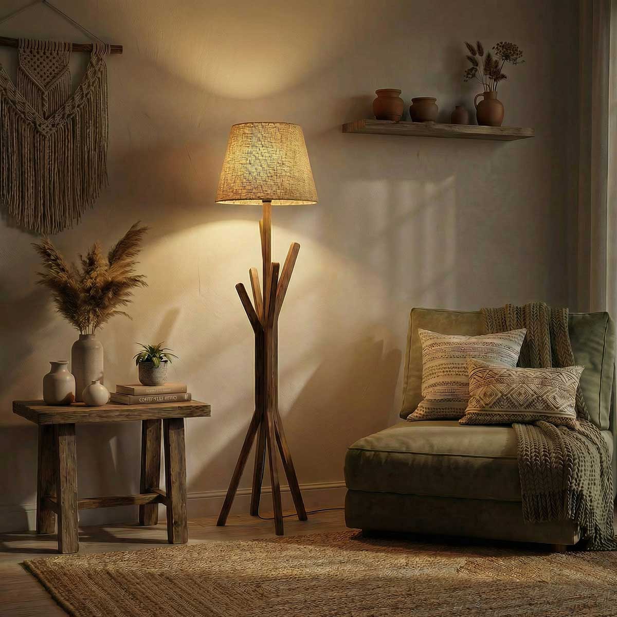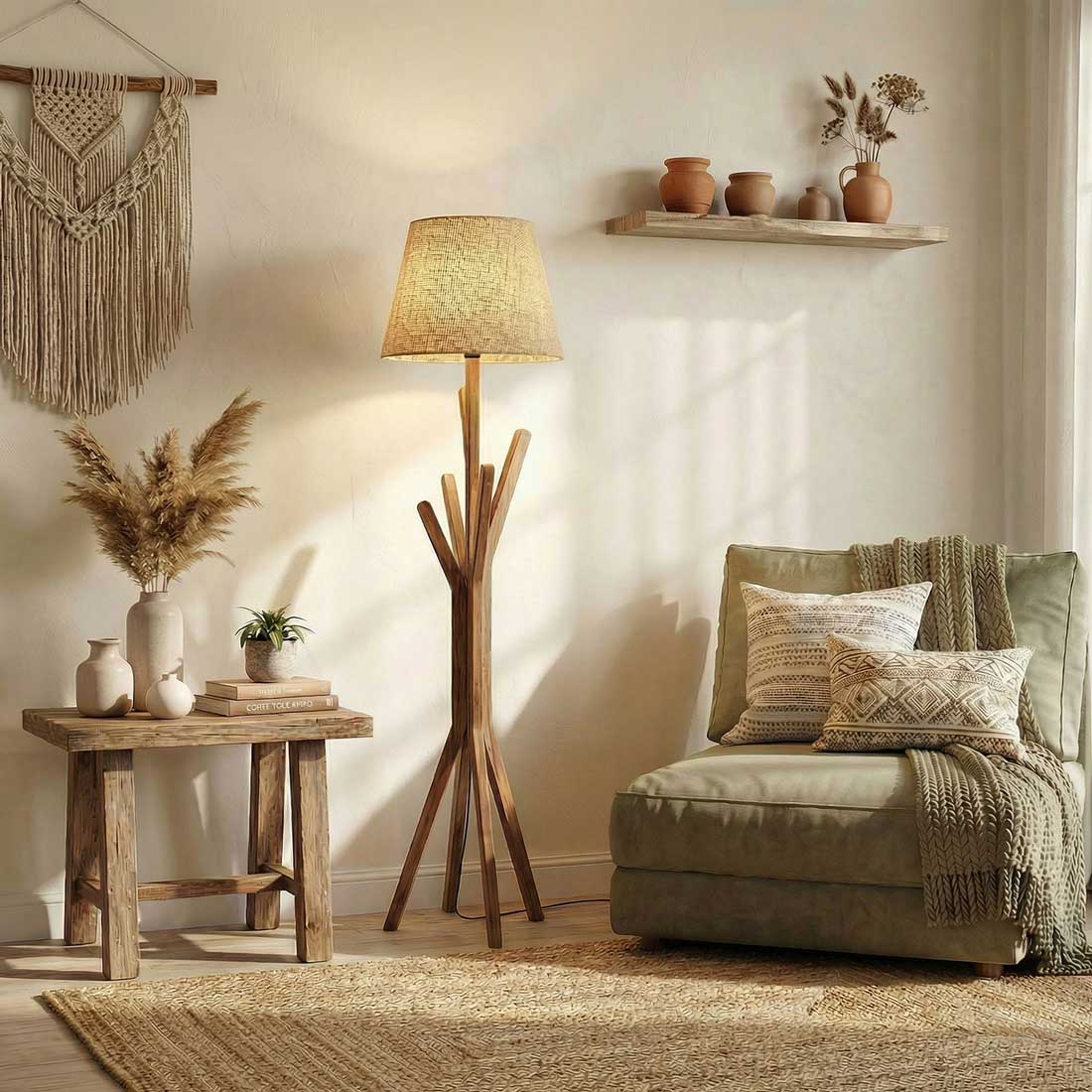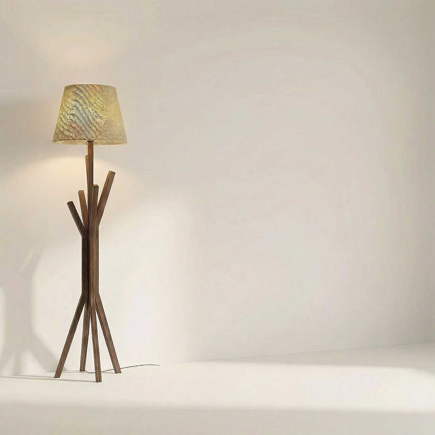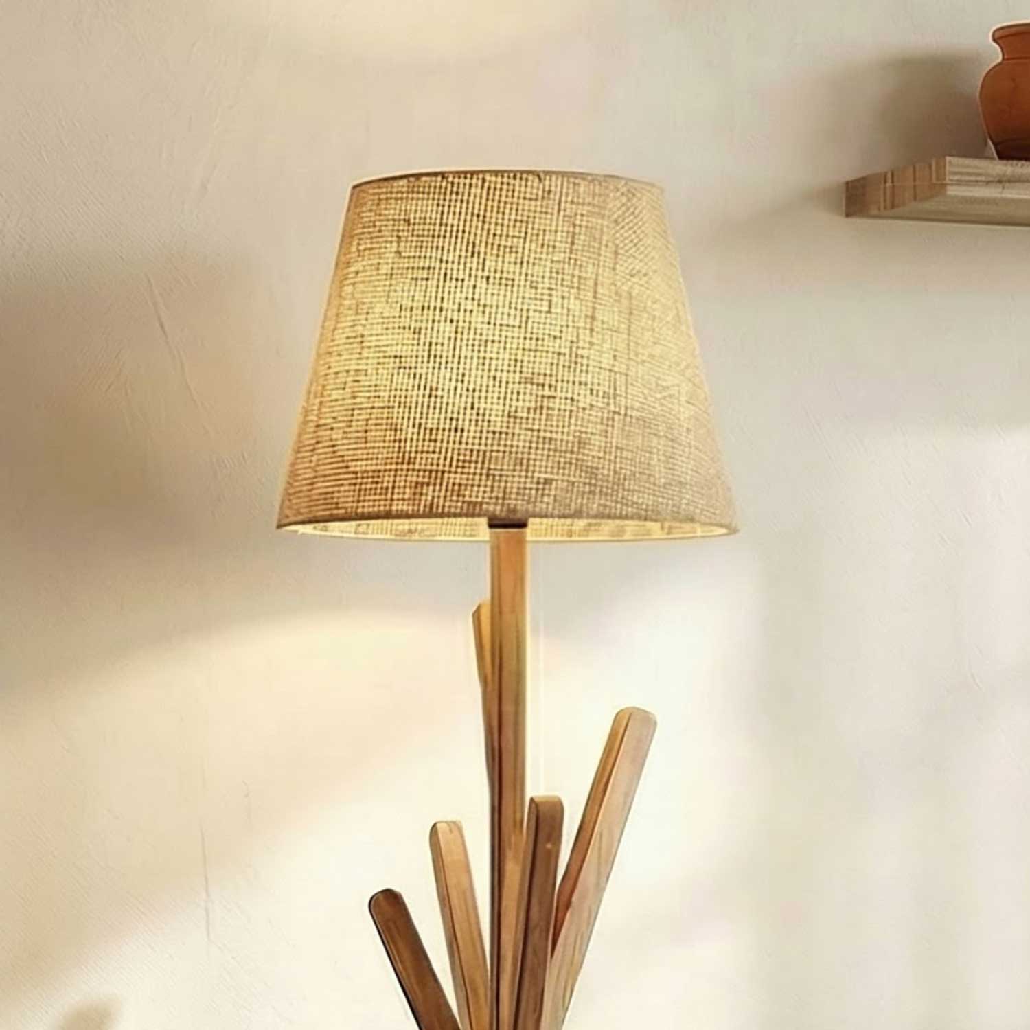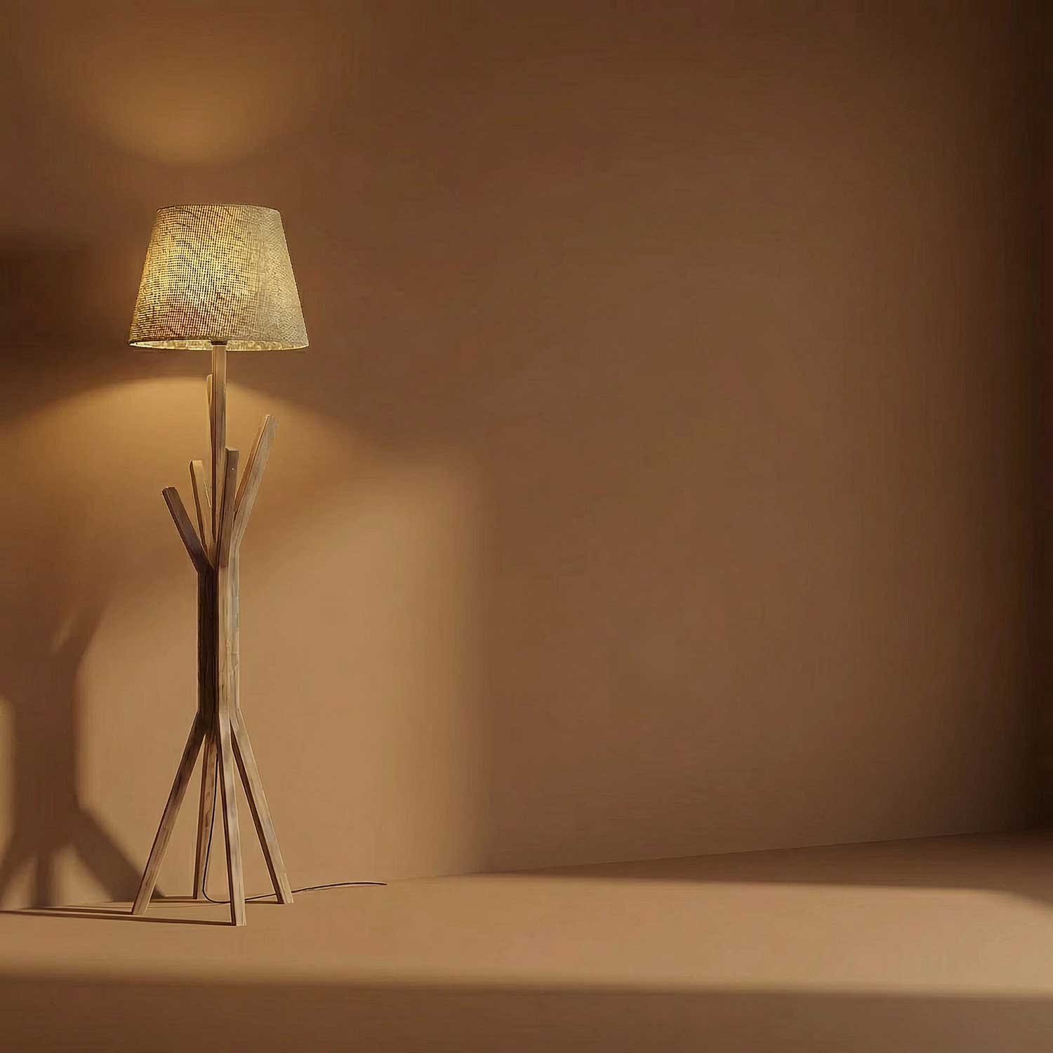 Solid Wood Vrikshya Beige Lampshade Floor Lamp With Brown Base