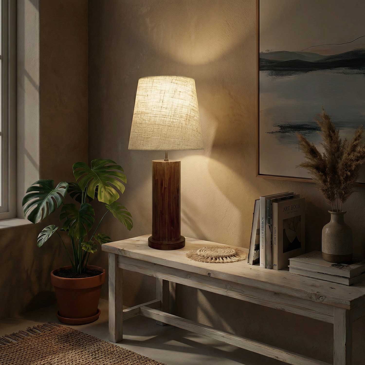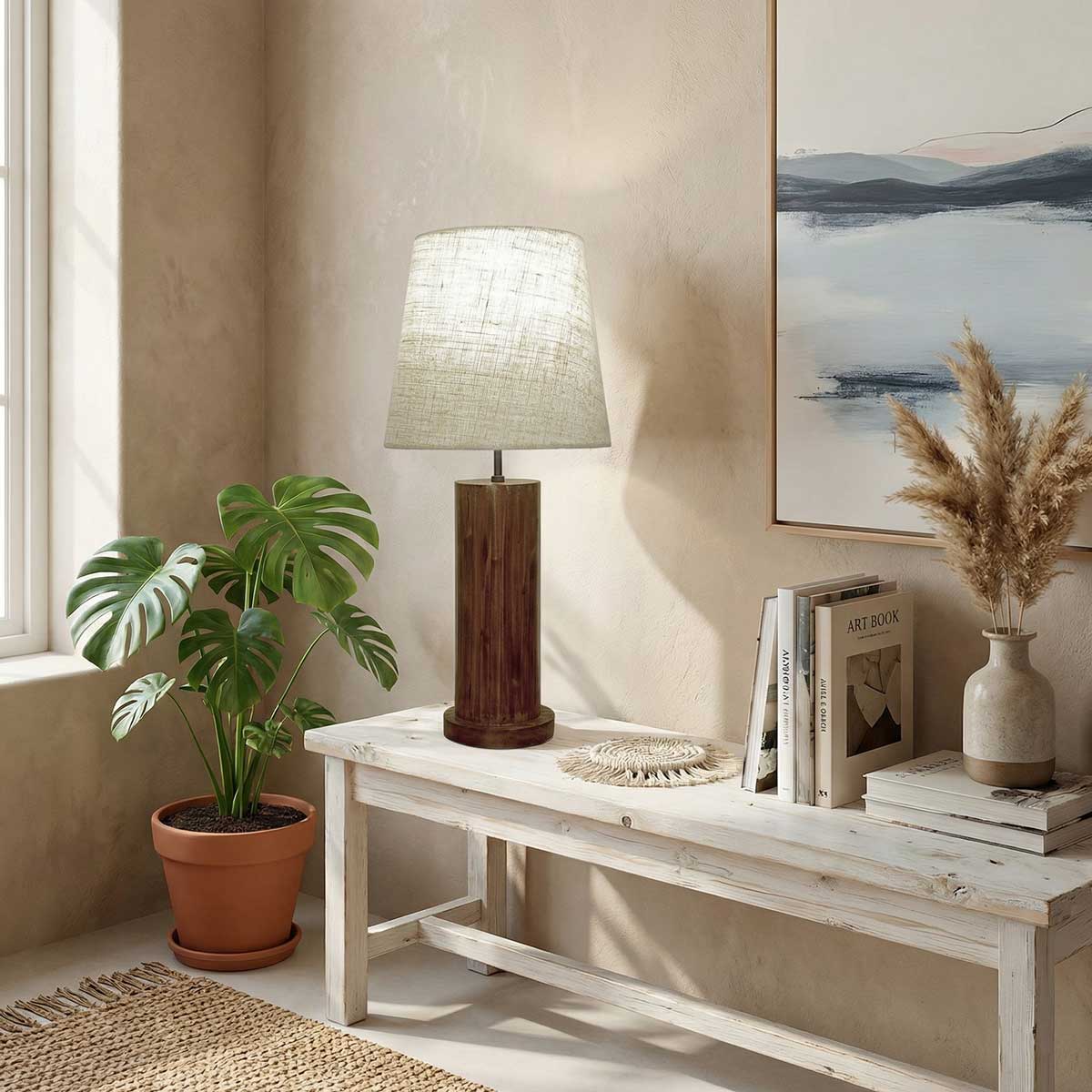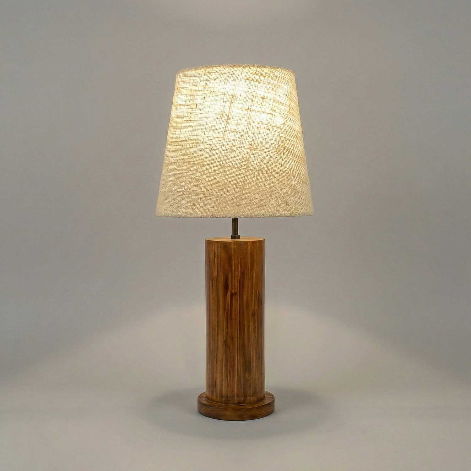 Solid Wood Cedar White Fabric Lampshade Table Lamp With Brown Base